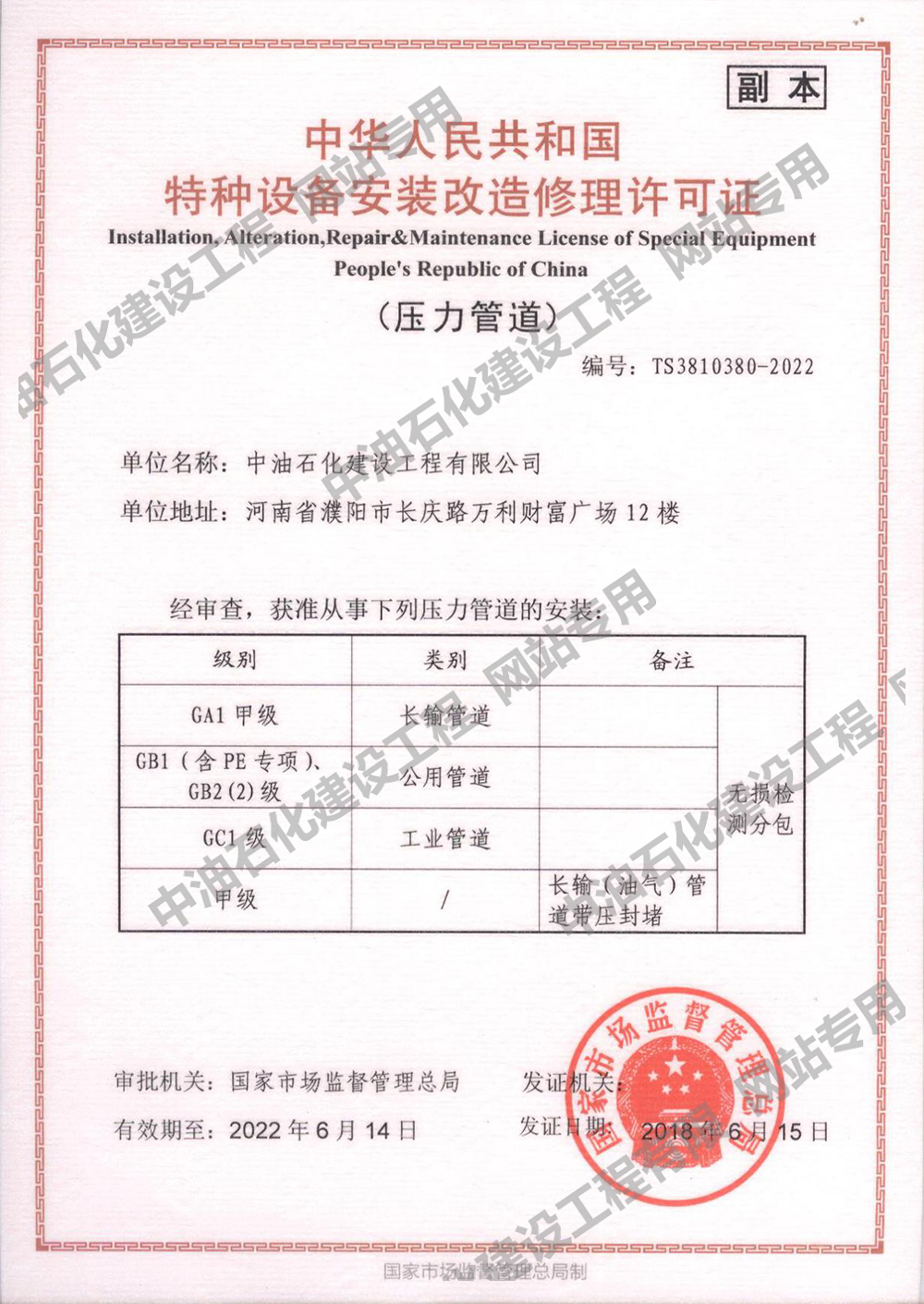 中油石化建設(shè)工程有限公司(CPPC)成立于2001年8月,公司現(xiàn)注冊資金1.1268億元。 經(jīng)過20年的發(fā)展,CPPC形成了以石油化工安裝工程、長輸管道工程、市政工程、鋼結(jié)構(gòu)制安為四大核心業(yè)務(wù),以管道技術(shù)服務(wù)、送變電工程、消防工程、維保-搶險-投產(chǎn)保運為四大輔助配套業(yè)務(wù)的核心技術(shù)品牌,具備PC總承包能力和EPCC總承包能力。至2022年,公司具有施工總承包資質(zhì)5項,施工專業(yè)承包資質(zhì)4項,不分等級2項;特種設(shè)備壓力安裝改造維修許可證,承裝承修電力,中國工業(yè)清洗企業(yè)物理、化學(xué)清洗A級資質(zhì)等。 公司成立20多年來,累計完成場站建設(shè)557座,管道施工6000多公里,輸電線路施工3700公里,電力電纜施工8000多公里,建筑施工950余萬平方米,年營業(yè)能力超過15 億元。